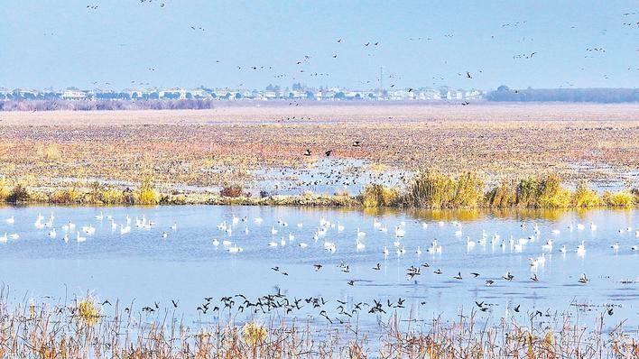 每年秋冬,洪湖湿地都会迎来一群远道而来的“客人”。今冬以来,这里已记录到水鸟38种、总数超过7万只,其中国家一级保护动物白鹤、青头潜鸭等珍贵身影频频出现。