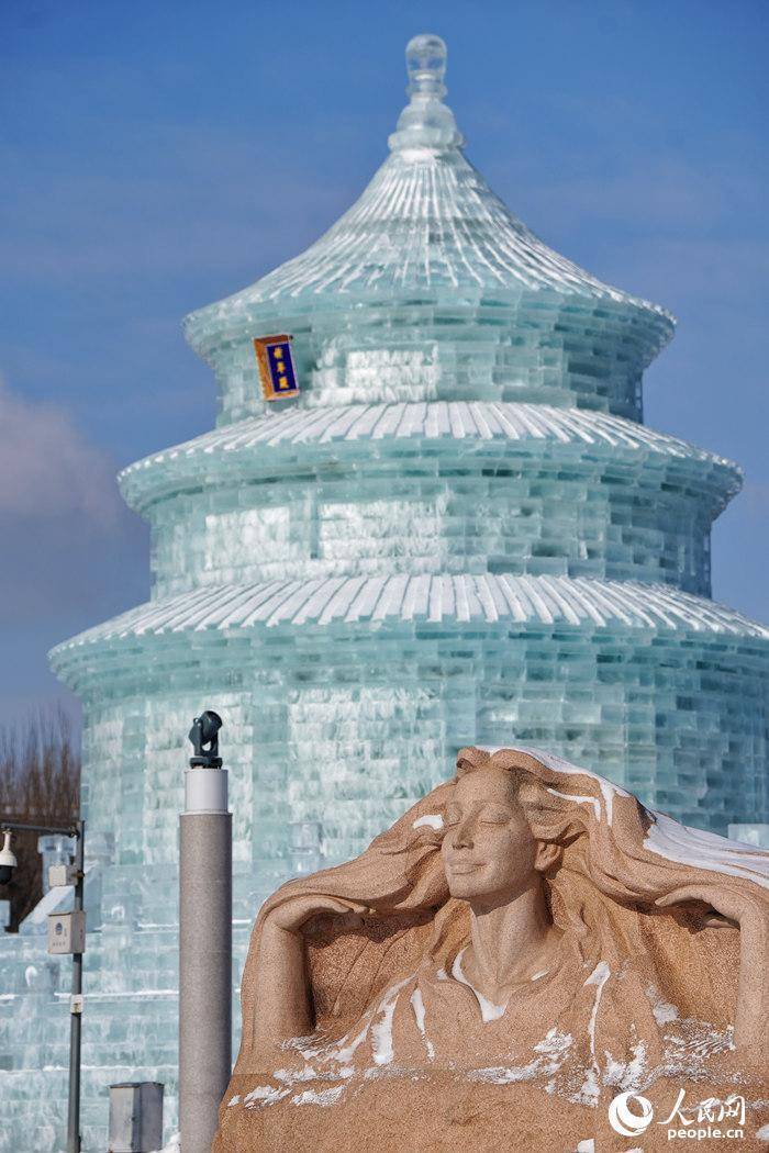“冰天坛”在阳光照射下宛如琼楼玉宇。人民网记者 李洋摄人民网长春1月8日电 (记者李洋)7日,以“盛世中华”为主题的大型冰雕“冰天坛”在长春市朝阳区文化广场惊艳亮相,吸引了众多市民游客前来观赏。