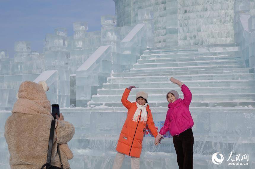 游客与“冰天坛”合影留念。人民网记者 李洋摄